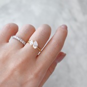 異なるサイズのペアシェイプを組み合わせたデザインは、シンプルながらも存在感を放ち、角度によって多彩なきらめきを楽しめます。