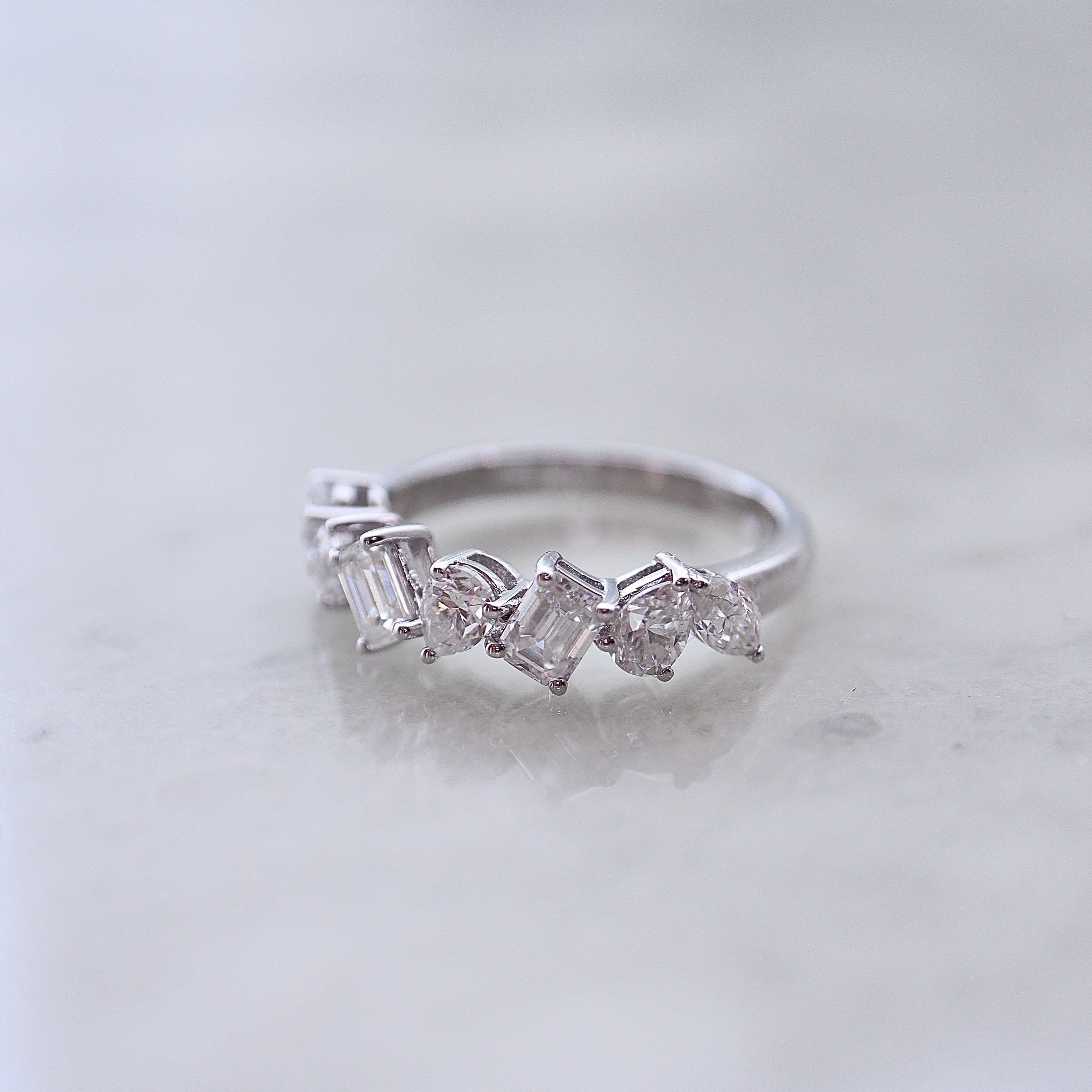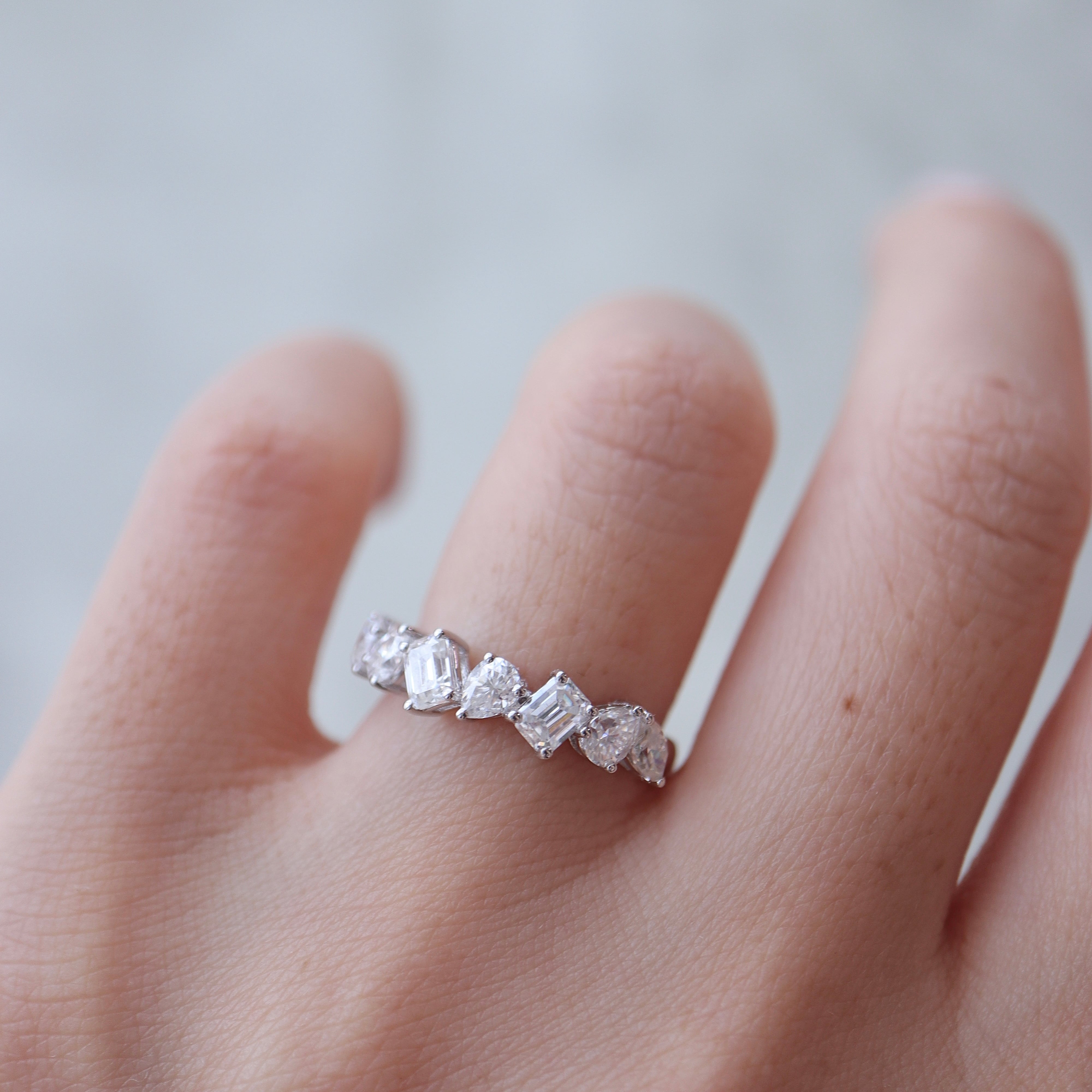 ラウンド、ペア、エメラルドカットなどの様々なファンシーシェイプを贅沢に組み合わせた、total1.5ctのモアサナイトのハーフエタニティリング。
