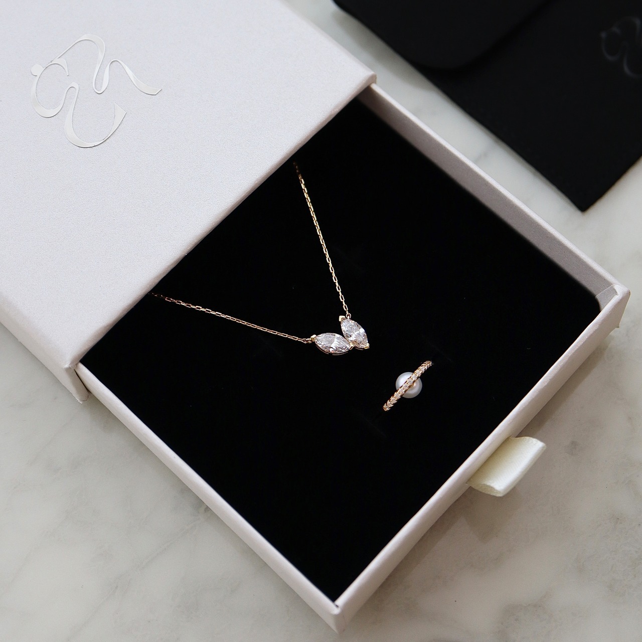 繊細に煌めくキュービックジルコニアと、華奢なネックレスが肌にしっとりと馴染み、胸元に凛とした存在感を与えます。