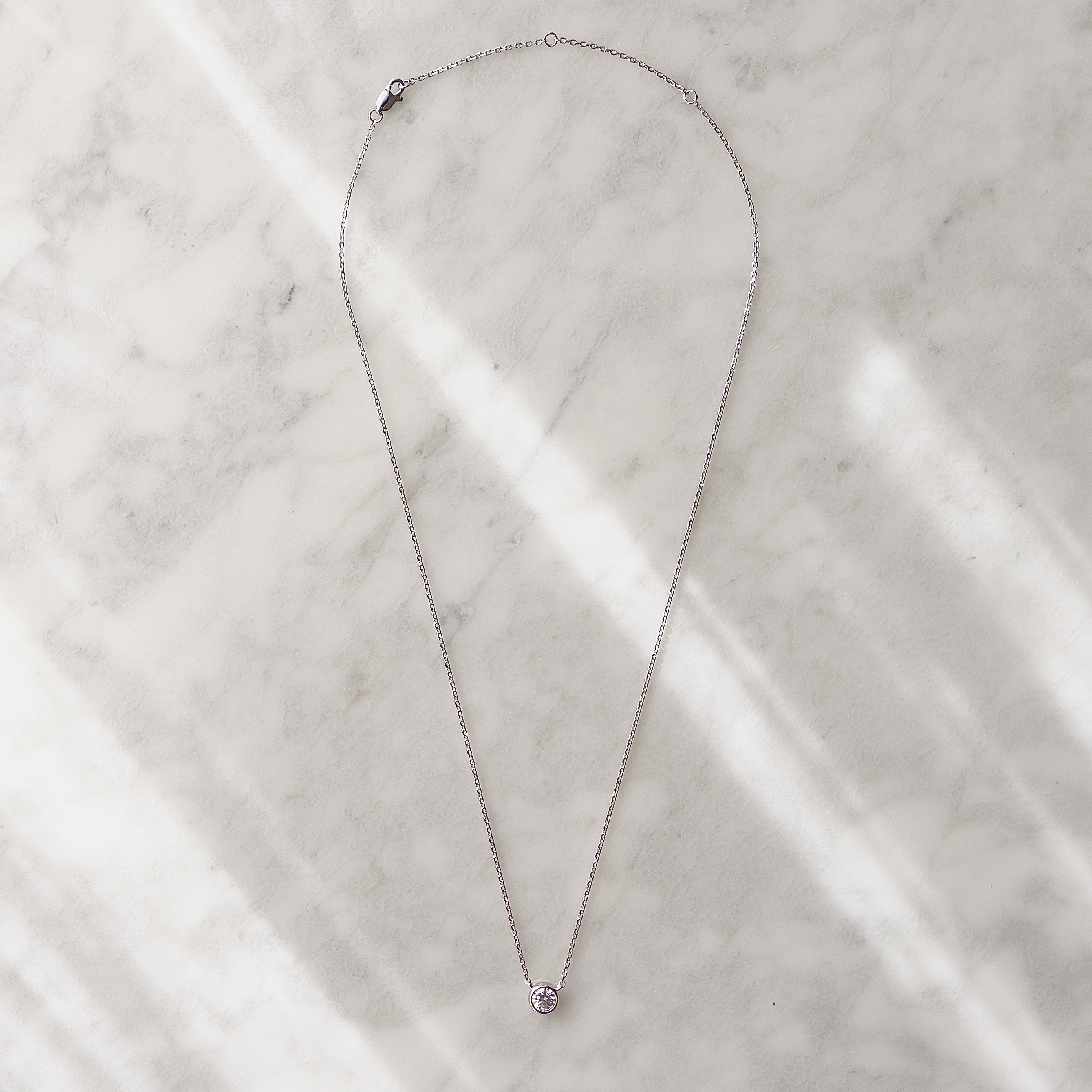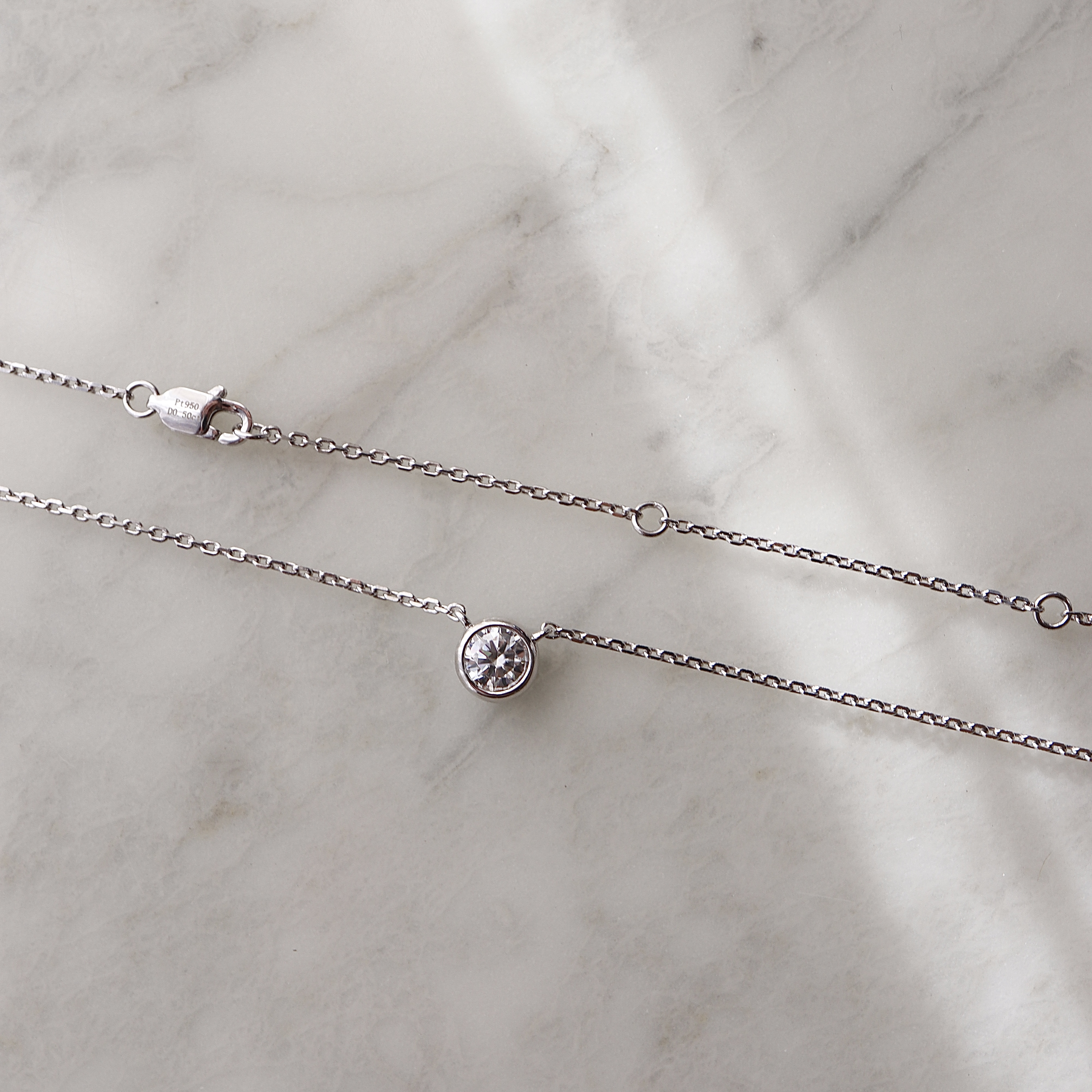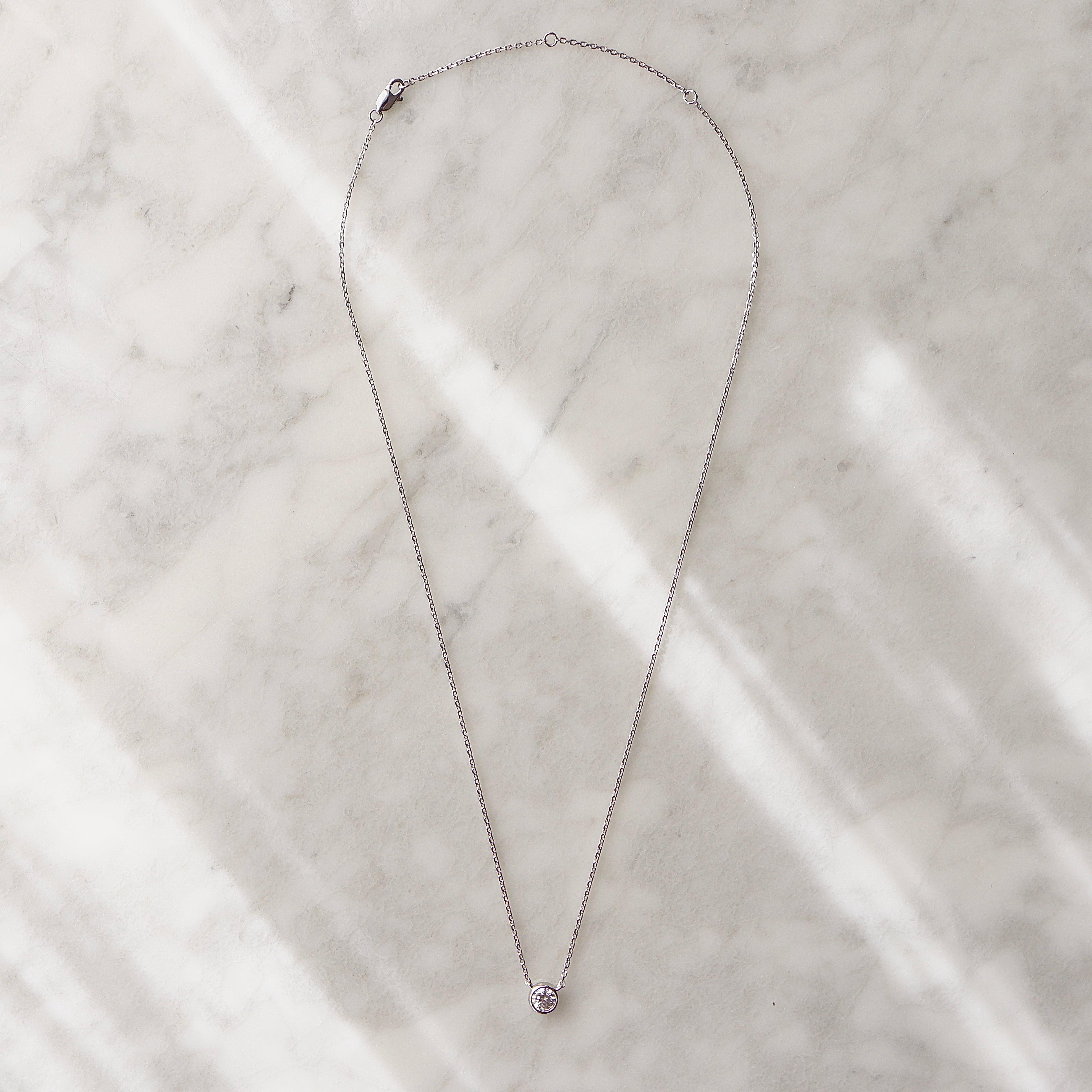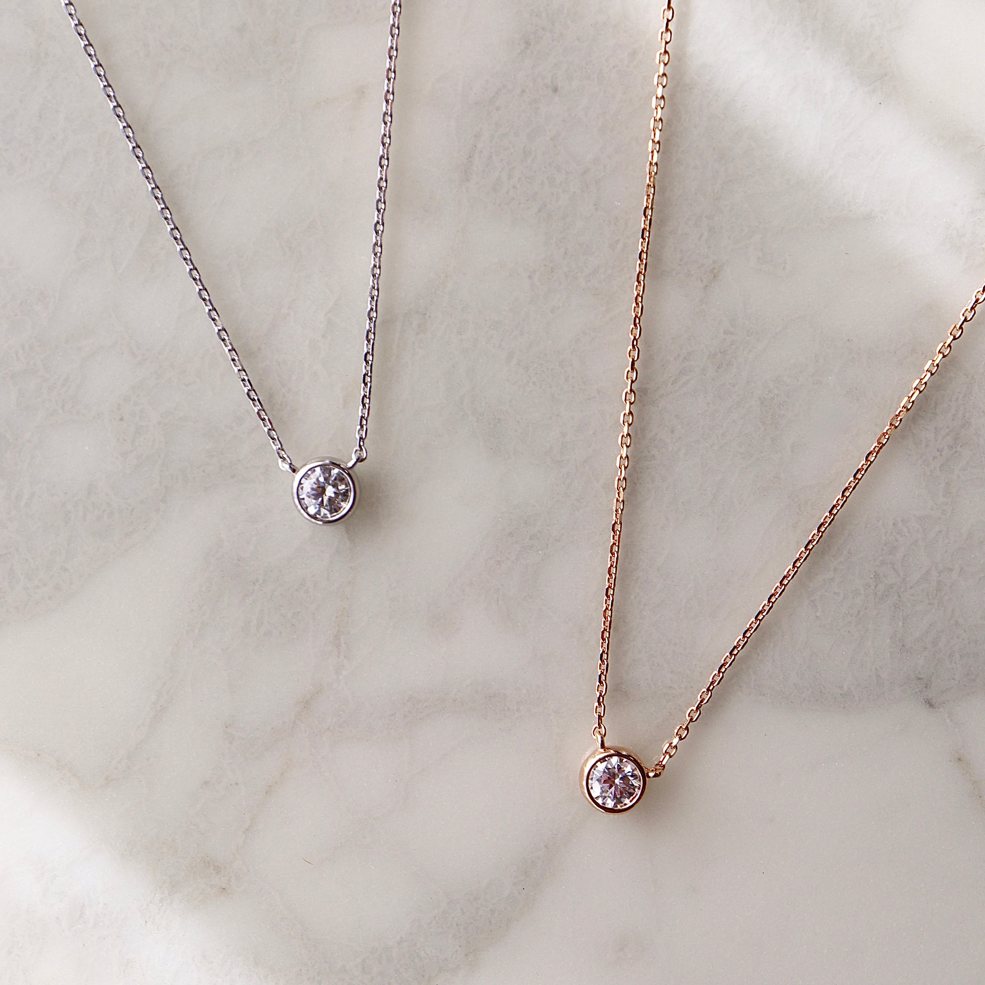 0.5ct のモアサナイトの輝きを、艶やかなベゼルに丁寧に収めた一粒ネックレス。